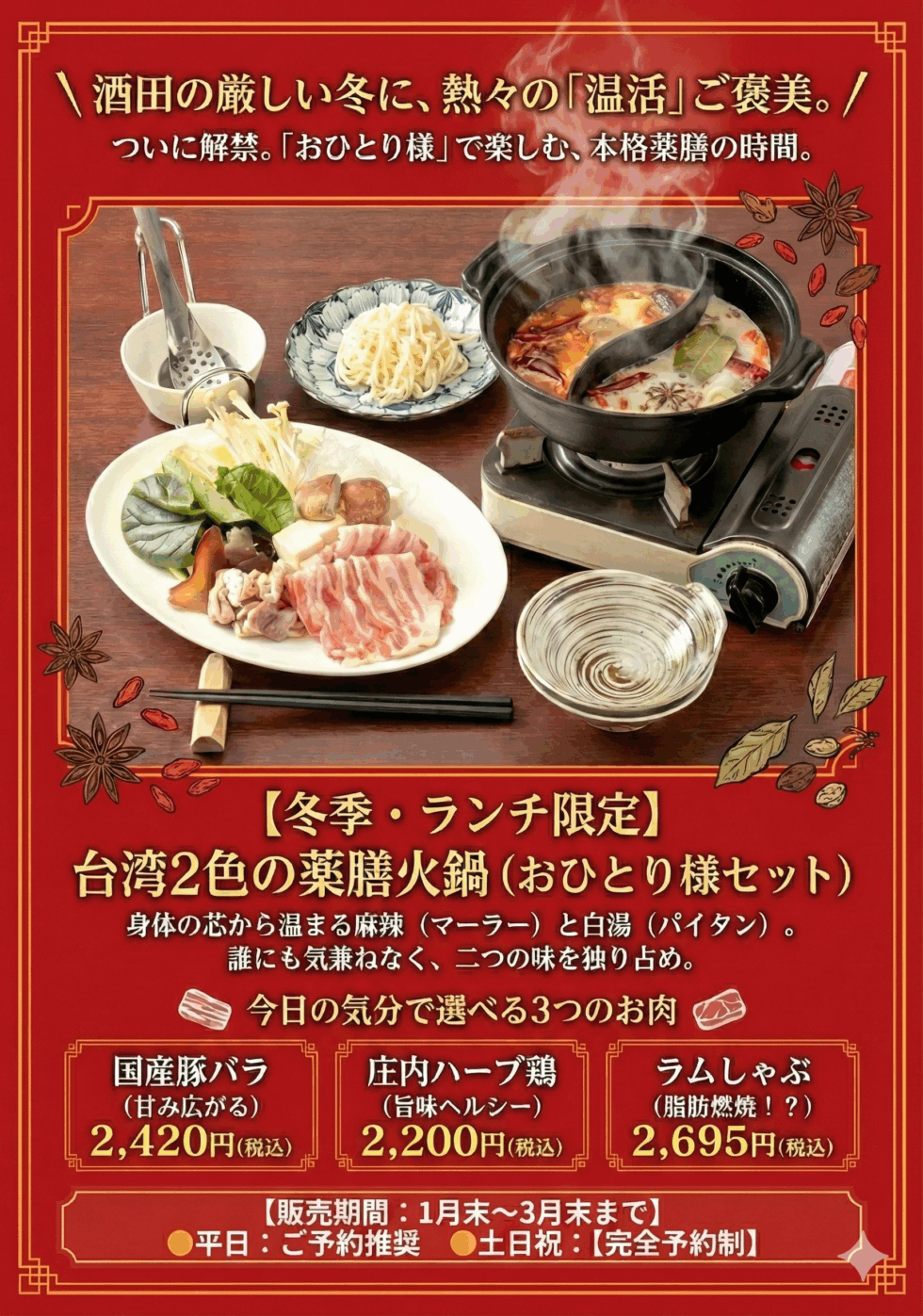 スタッフ一同、身体温まる『薬膳火鍋』をご用意してお待ちしております😊✨